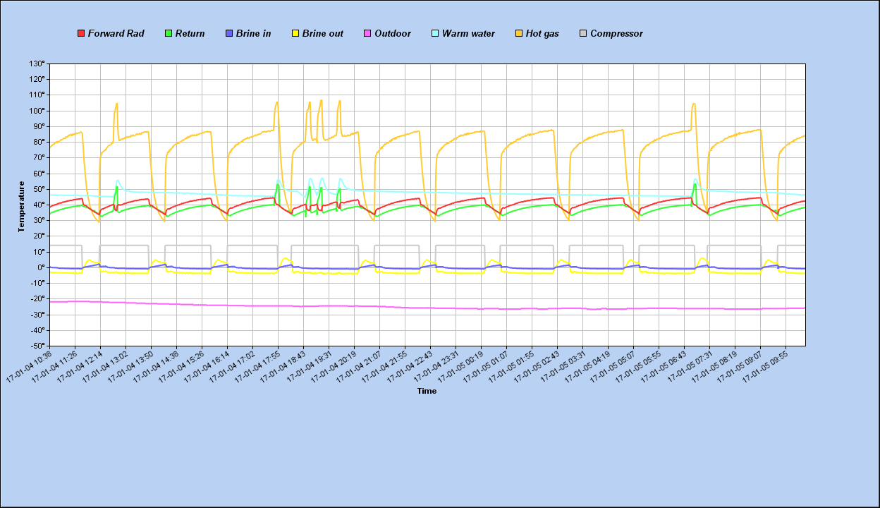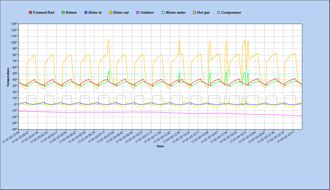 Tuostahan se selviää helposti että kone käy noin puolet ajasta tuollaisella kelillä. Jos hystereesiä/kytkentäerotusta kasvattaa tällöin voi saada esim 1h - 1h käyntilepoajat mutta tietysti tuossa on se että alkaako tuo jo näkymään huonelämpötilassa? Liian pitkät siivut näkyvät jollaintapaa myös laskevassa hyötysuhteessä laskeneen liuoksen lämpötilan ja sekä nousevan menoveden myötä.