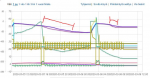 Mielestäni lämpötilojen ( laskettu/menolämpö) iso ero johtuu siitä, kun alkaa LV:n lämmitys ja syöttö lämpöverkkoon lakkaa, rupeaa asteminuutit, joita nähdäkseni ulkoinen menoanturi BT25 ohjaa, laskemaan voimakkaasti. Kun siirrytään takaisin lämmitykseen koettaa kone kuroa asteminuutteja ylös syöttämällä melko lämmintä vettä lämmitysjärjestelmään.