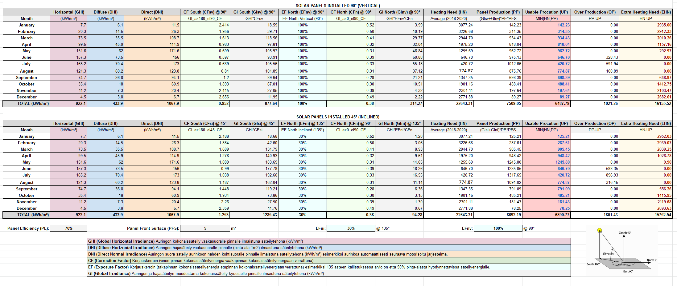 ) ja laskeskelin sen pohjalta sitten mitä tuollaisilla putkilla saisi lämpöä aikaan suhteessa lämmitystarpeeseen ja kun otetaan huomioon että milloin sitä lämpöä sitten myös tarvitaan. Tässä liitteenä tuloksia arvioinnista, muu data Ilmatieteenlaitoksen